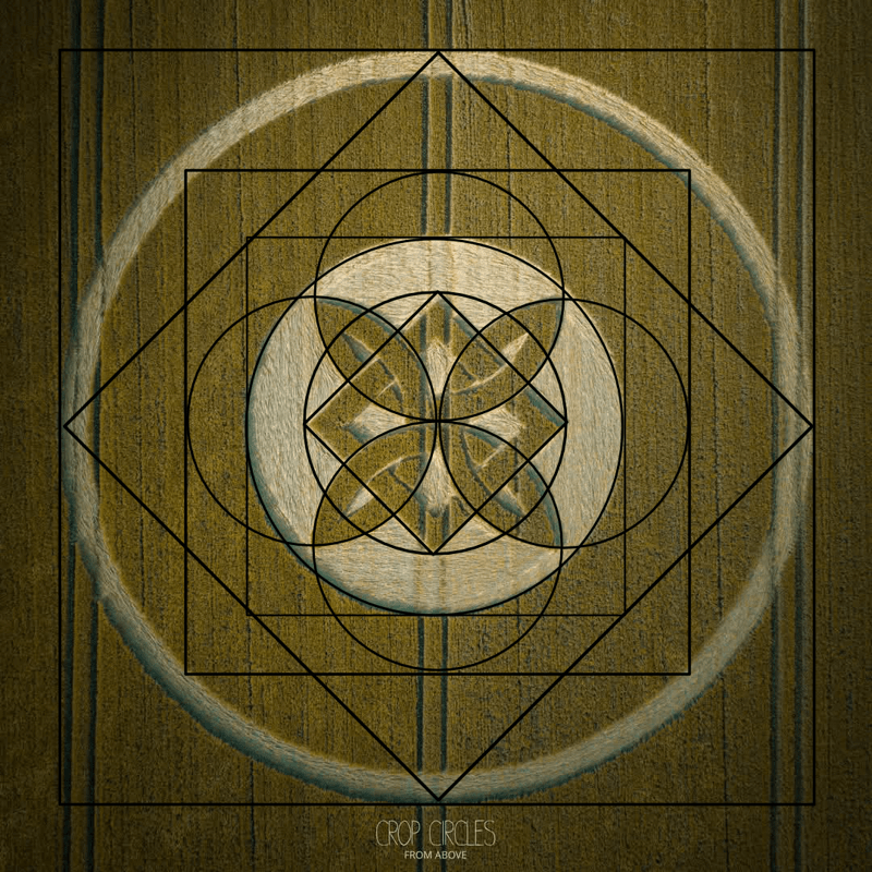 Located in a field near Sutton Veny, Warminster, 51° 10′ 05″N, 2° 09′ 12″W, in barley wheat, this formation contains obvious square geometries, in addition to other hidden geometries not so readily apparent. (Original Images from Crop Circles From Above, overlaid geometry by myself.)