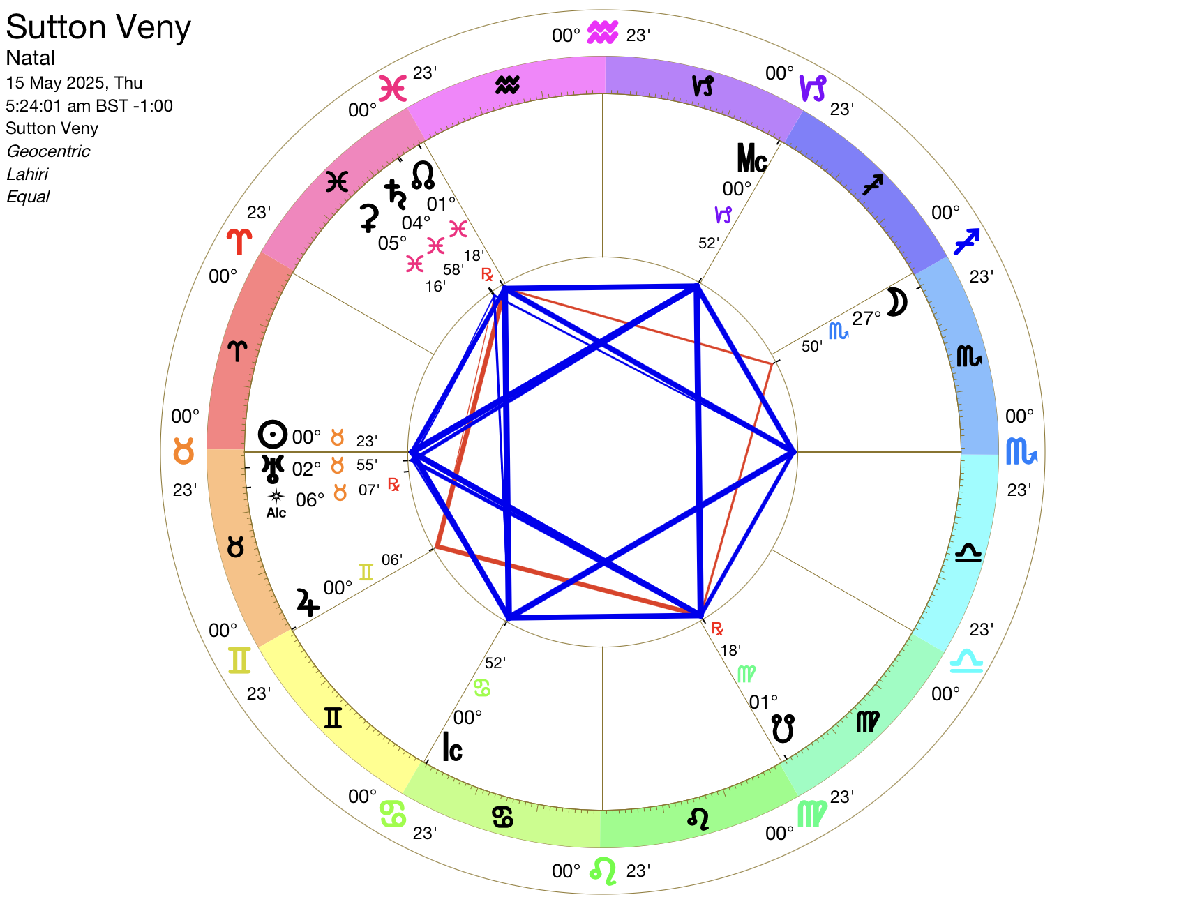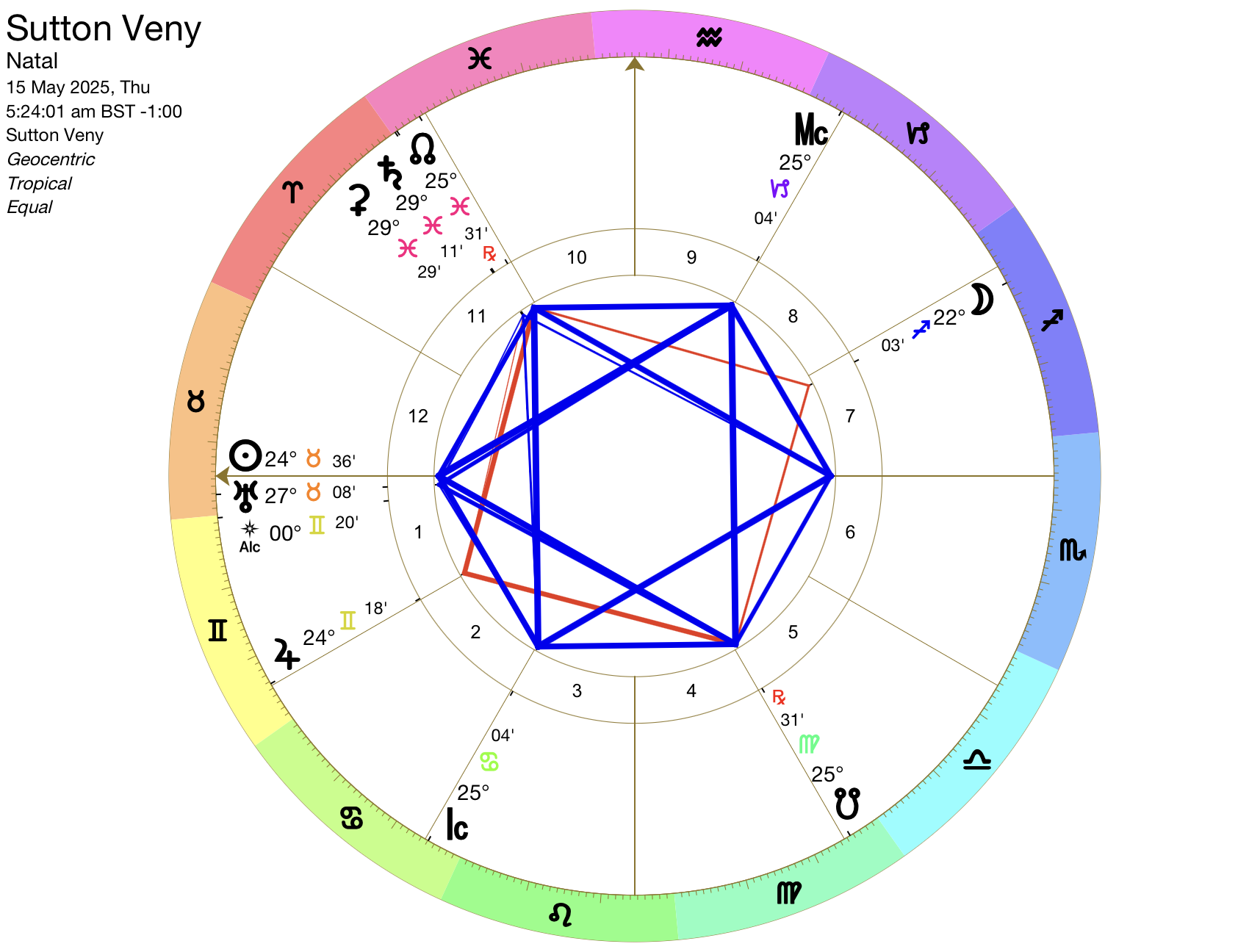 Left to Right: Jupiter rising, Moon Setting. Sun at Mid-Heaven. Some Asteroids added to chart, Hygeia, Chiron, Eris, Vesta, Pallas, Juno, all on Sidereal zodiac cusps; Vesta at a mid-point.