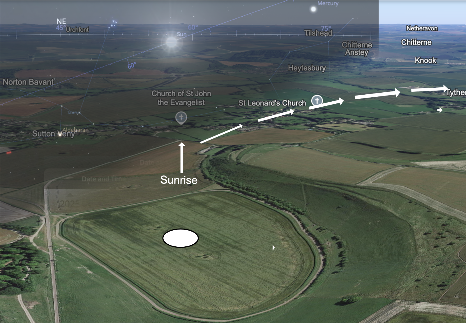 From the formation, the sun rose in line with the nearby Church of St John. Behind the church, from a birds eye view we can see the tallest hill in the area, Martinsell Hill far off on the horizion, an area where Crop Circles have occurred often over the years. Also curiously we see Mercury, having already risen pre-dawn, above the other local Church of St Leonard. This is something I’ve noticed over my years of research – crop formations in the landscape appearing to line up with other sacred sites, including churches.